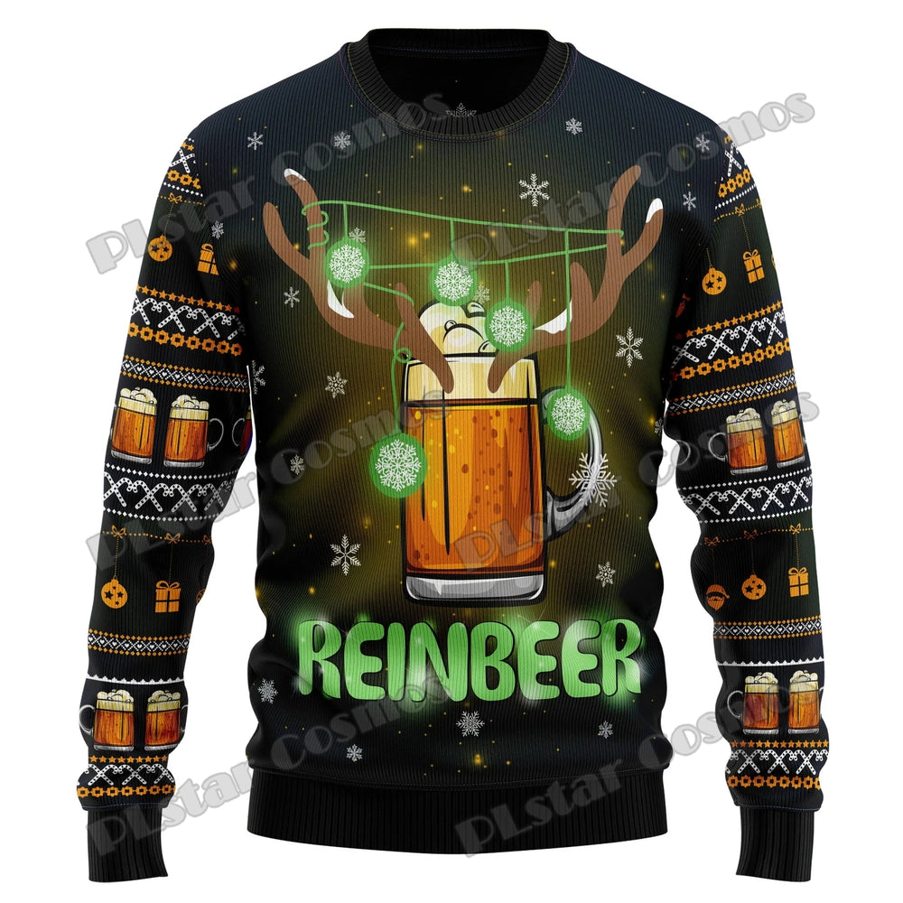 Raise a glass to holiday cheer with the Jingle Beer ugly Christmas sweater. This cozy unisex pullover blends a warm winter feel with a vivid 3D knit-look print of beer mugs, snowflakes, and festive motifs - perfect for parties, office exchanges, and family photos.
