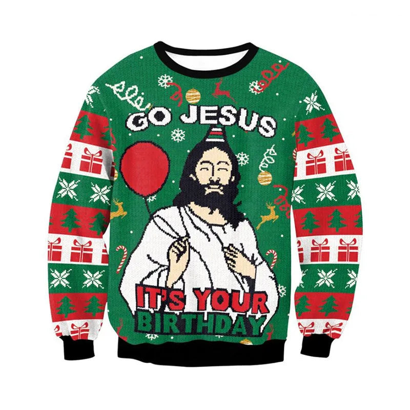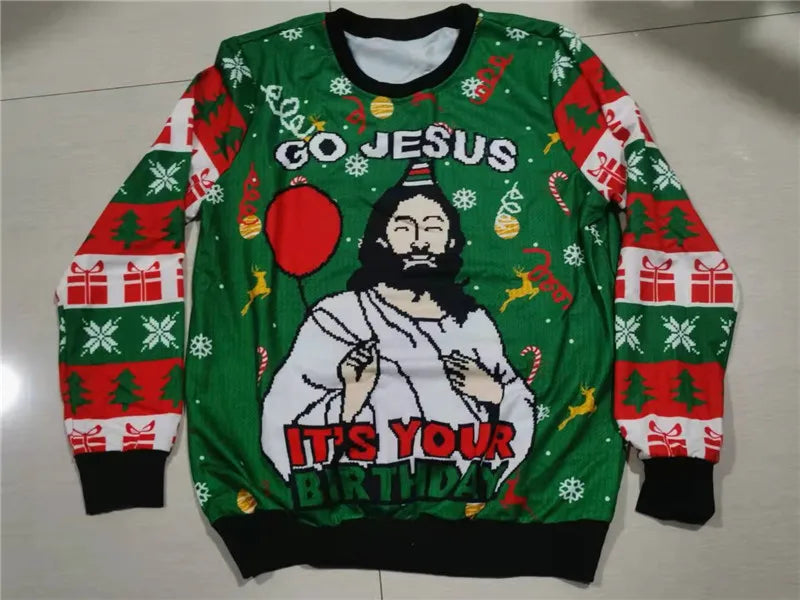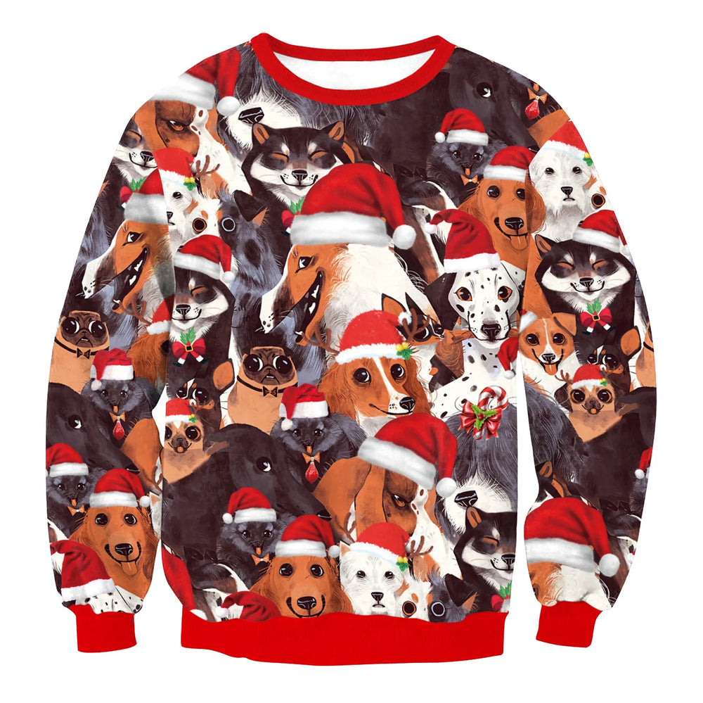 Bring on the holiday laughs with a tacky-cute ugly Christmas sweater featuring a vivid 3D knit-look print of a festive dog, snowflakes, bells, reindeer, and Santa. Perfect for office parties, white-elephant exchanges, and cozy winter nights.